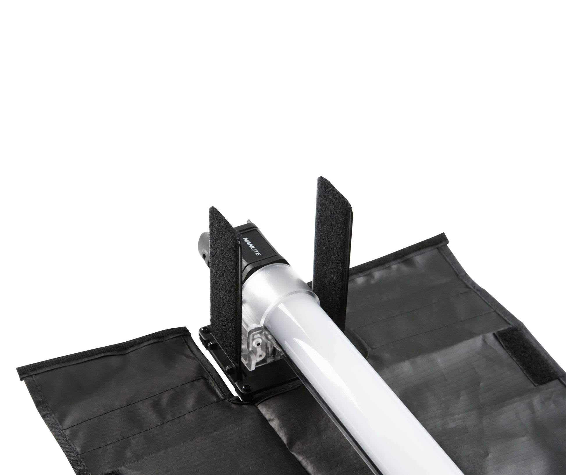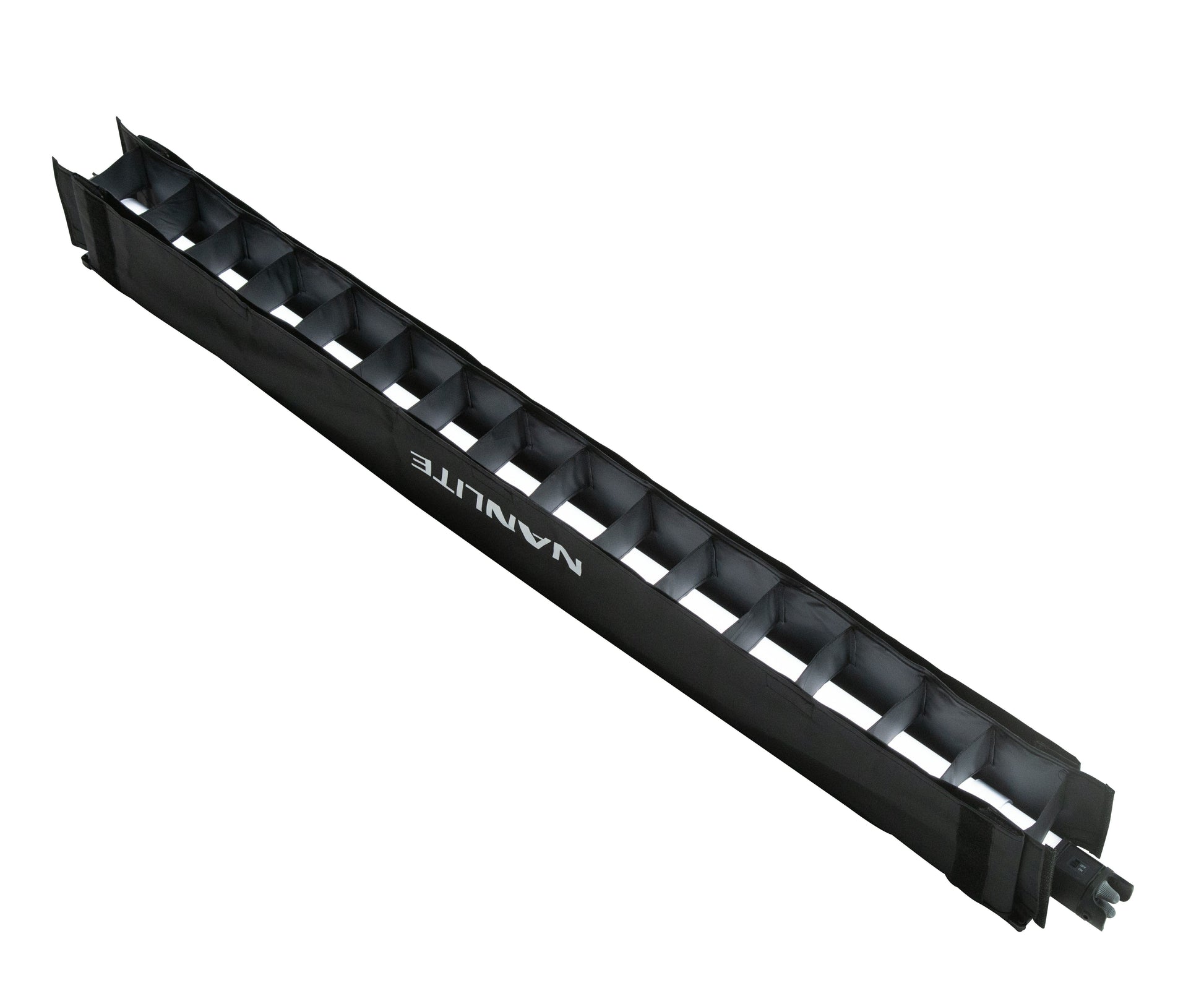 A fabric barndoor and eggcrate grid accessory designed for use with the Nanlite PavoTube II 30C LED tube light that lets you shape, control, and refine the tube’s light output by minimizing spill, tightening the beam, and improving directional control — ideal for portrait photography, video, interviews, and creative lighting scenarios.