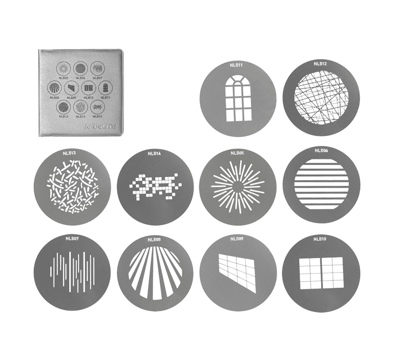 • Set of 10 Gobo Discs: A well-rounded mix of window shapes, patterns, and grills to enhance visual creativity in photo and video projects.