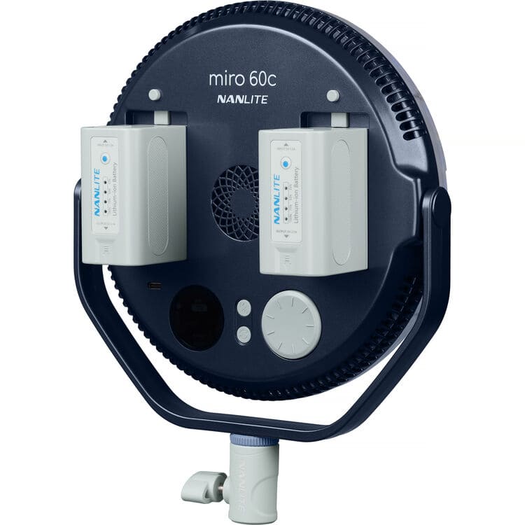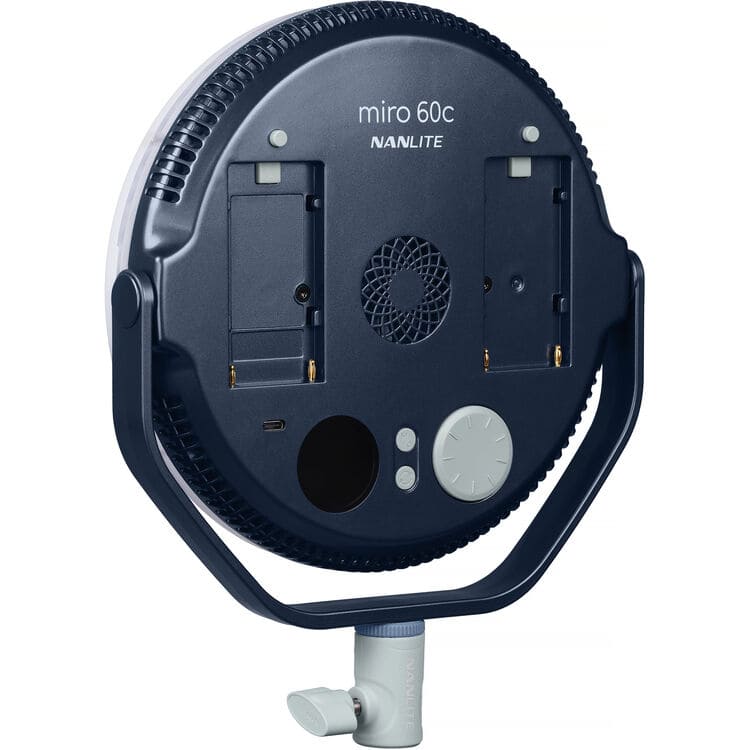 The Miro 60C supports AC power, USB-C power banks, or dual NP-F batteries for extended runtime. A 360° adjustable yoke allows precise positioning, while the mint blue finish adds a premium look to any setup.