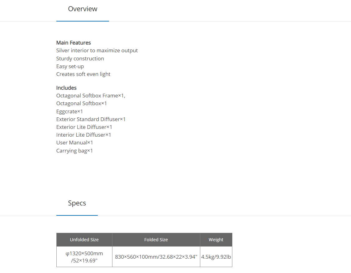• Shape and Size: It has an eight-sided, octagonal shape with a large diameter of approximately 4 feet (132 cm) when open, which provides a large light source for a soft, wraparound quality of light.